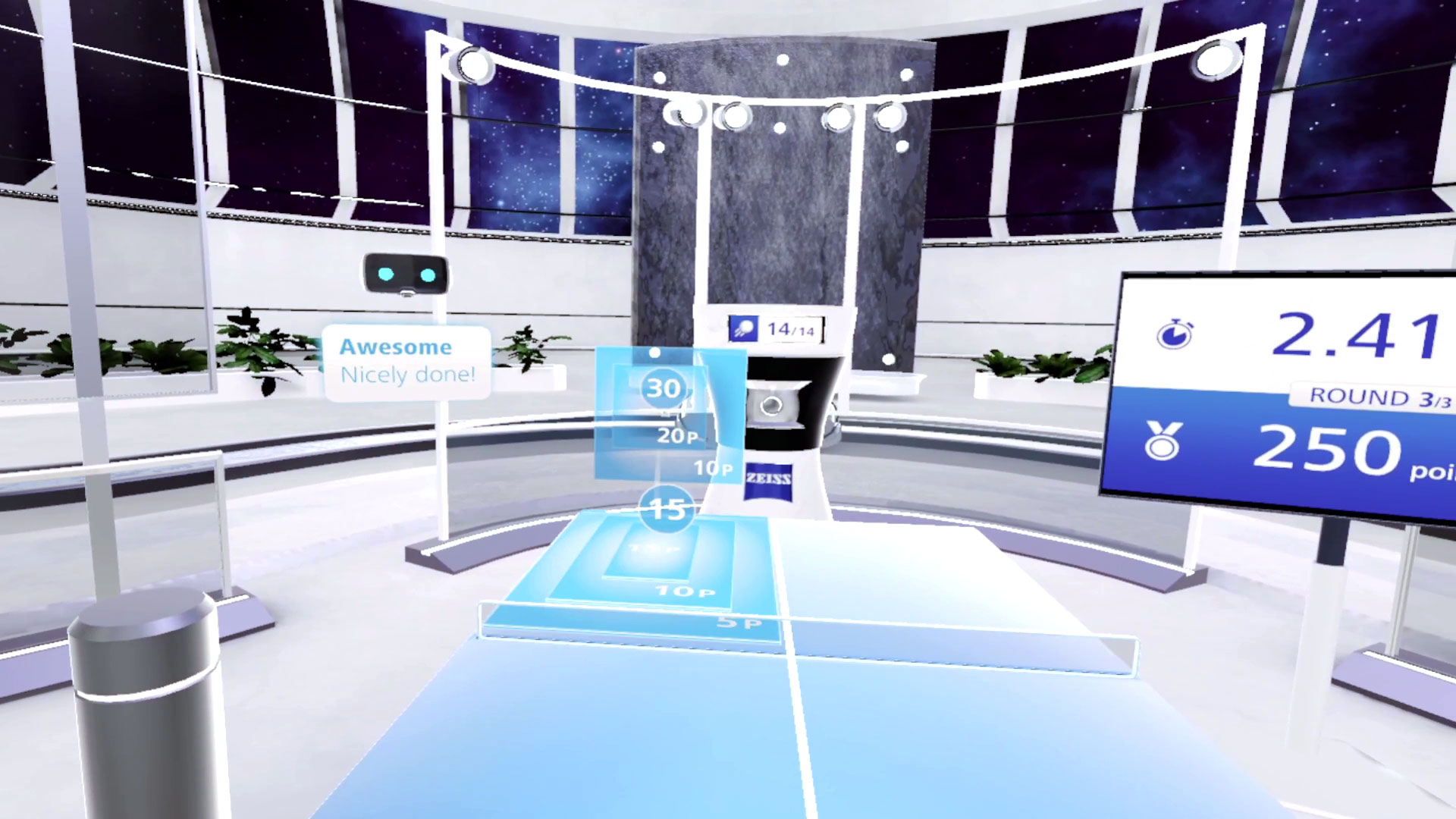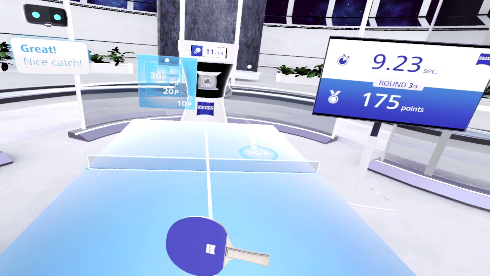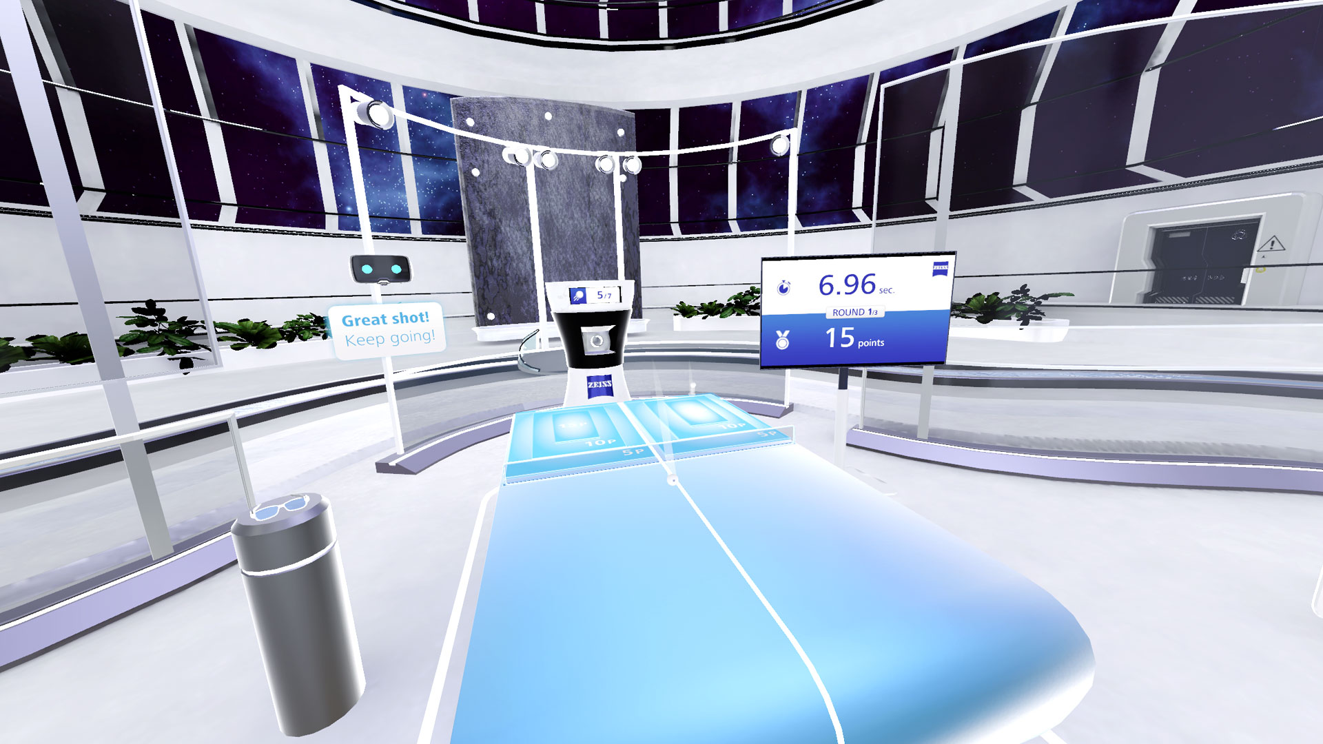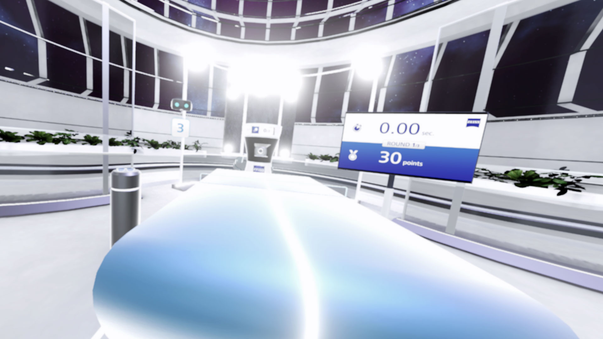 What better way to understand the difficulties of living with an eye-disorder is there, than to experience it yourself – at least for a couple of minutes? What better solution for this task, than a VR simulation? Visitors enter a futuristic research facility of the ZEISS Vision Science Lab and are challenged to compete for the highest score in a game of ping-pong. But not before choosing one of two eye disorders, a scotoma or a cataract. They are greeted by a virtual assistant that guides them through the experience. After accustoming themselves to the virtual racket in a training round, the simulation of the eye disease is initiated and players now have to try and score as many points as possible by hitting various target areas on the opposite side of the table. To make the simulation as accurate as possible, headsets with SMI eye-tracking were used, allowing the simulated visual distortions to follow the user's eye movements on the screen. In the last round, players are equipped with special glasses that might in the future be able to partly correct the simulated distortions. After the time is up, scores of the different rounds are displayed to compare one's performance with and without the handicap. In addition to the trade show experience, ZEISS and NMY are continuing to work on VR simulations of central vision loss eye disorders within the bounds of the BMBF funded research project "IDeA - Integrated Diagnosis & e-Assistance System for AMD Patients".