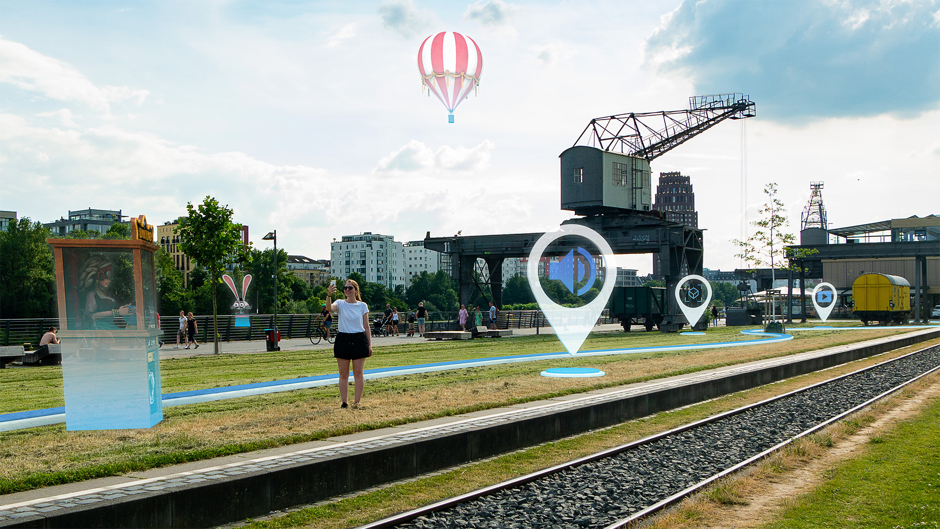 floating about is a location-based AR game where players explore a mysterious, virtual parallel world on nightly wanderings through their city. A flashlight-like gaming device fitted with a mini-projector enables them to uncover this hidden world behind the cities walls. It is populated with fantastical flora and fauna, whose appearance is based on data from Twitter and OpenStreetMap.