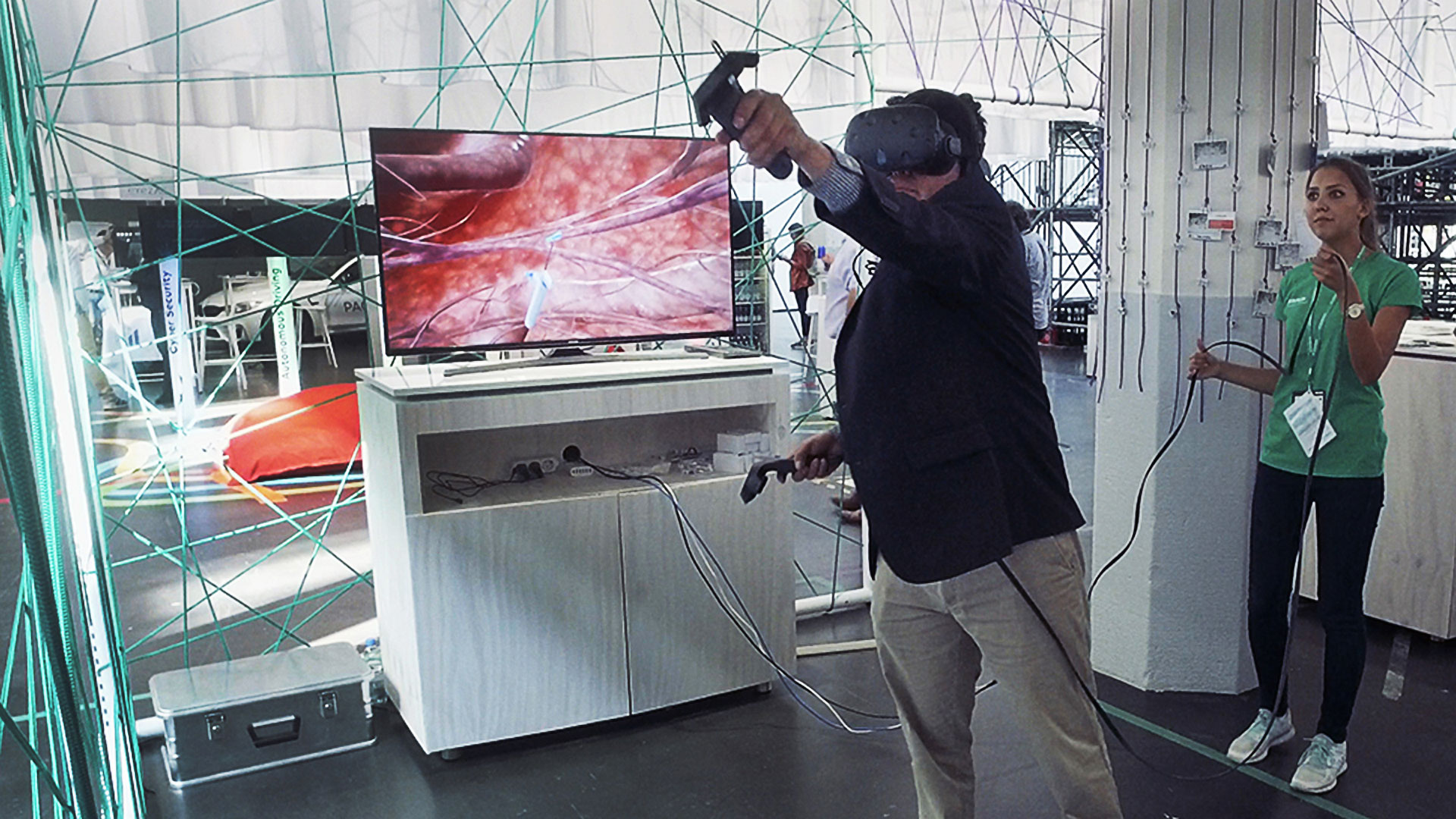 In the room-scale VR experience for the HTC Vive, visitors slip into the role of an up-and-coming surgeon of the future. Tasked to complete their final medical exam, players try to remove as many damaged blood vessels out of a dummy patient's organs in a simulated sci-fi surgery. To do that, they first have to examine the patient's body with a scanner and find an injury. They then get to control a nanobot that is injected into the affected organ. Equipped with two forceps loosely based on actual surgery equipment, players pull out the malicious vessels to earn points and beat the high score. A leader board allows for comparison to other participants and works as an incentive to try again and improve one's performance.