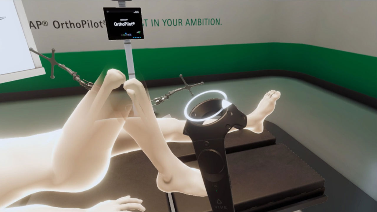 Information that would normally be communicated via the OrthoPilot®'s screen is displayed as a spatial UI around the knee in VR.
