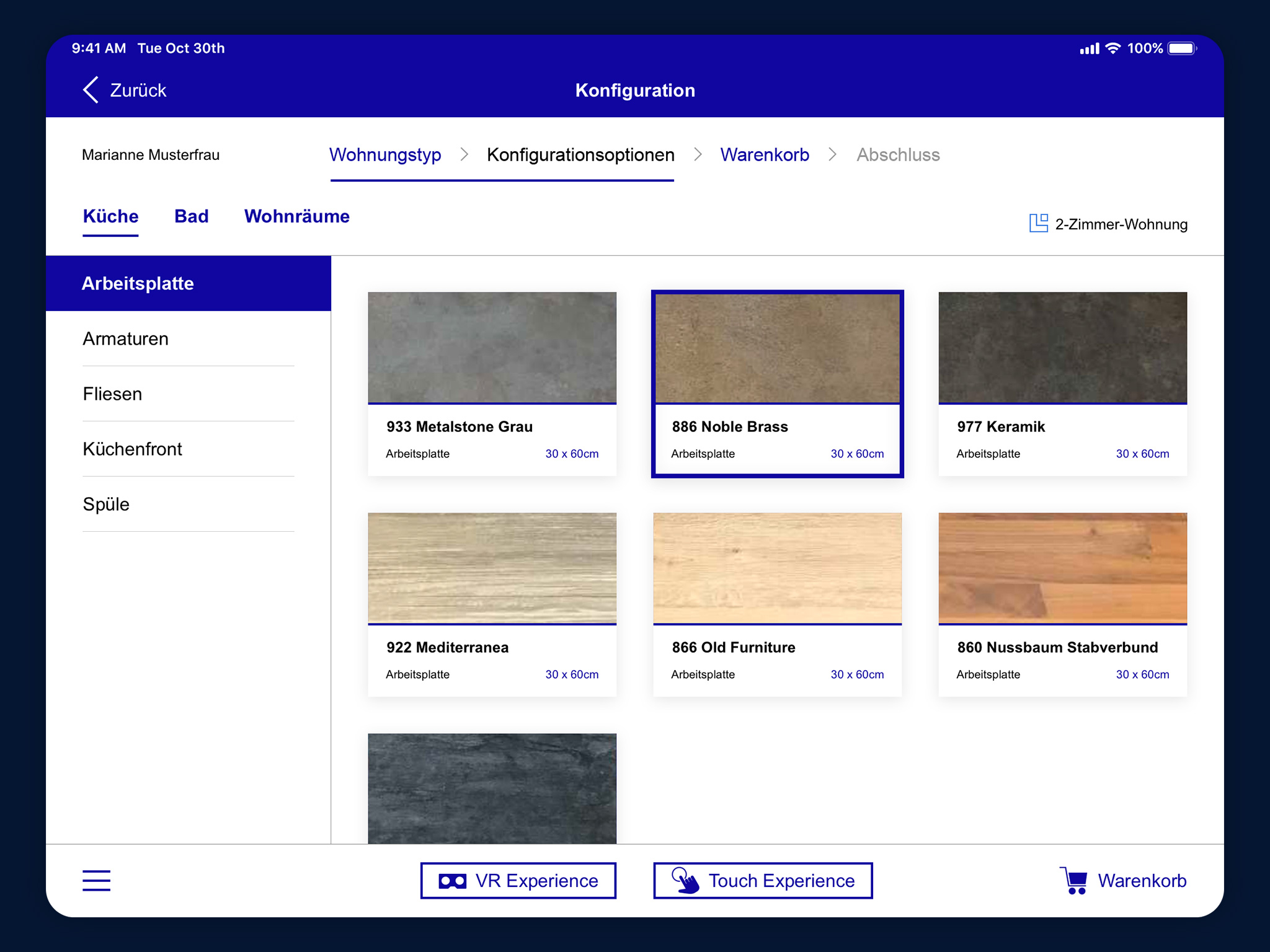 Using the consultant app, sales staff can select items out of a product portfolio to add to the configuration. In a showroom situation, the selection of flooring options for example could be accompanied by looking at real samples of the materials.
