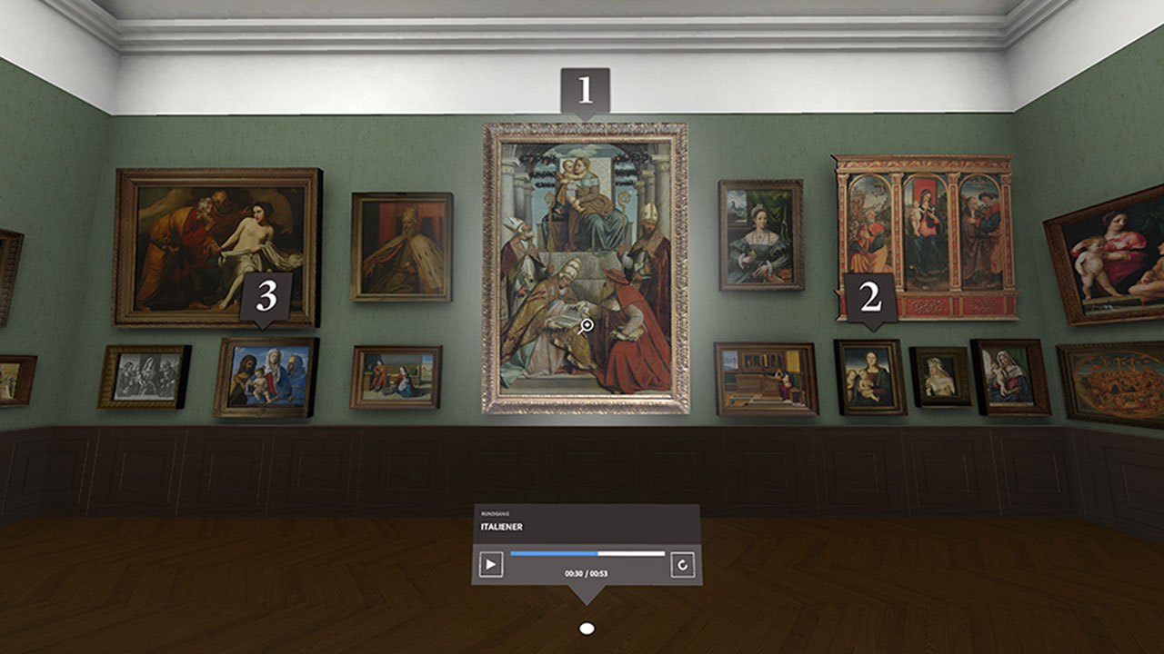 Standing in front of today's Städel after starting the VR experience, users travel back in time to enter the museum in its opening year of 1878. There they have the possibility to explore over 600 paintings on two floors. Users can freely move through the 15 fully reconstructed exhibition rooms on their own or choose between two audio-guided tours. Each painting can be examined in detail, conveniently sliding right in front of the user, on the click of a button. A low-key UI and atmospheric sound deepen the immersion while providing helpful tools to navigate through the experience.